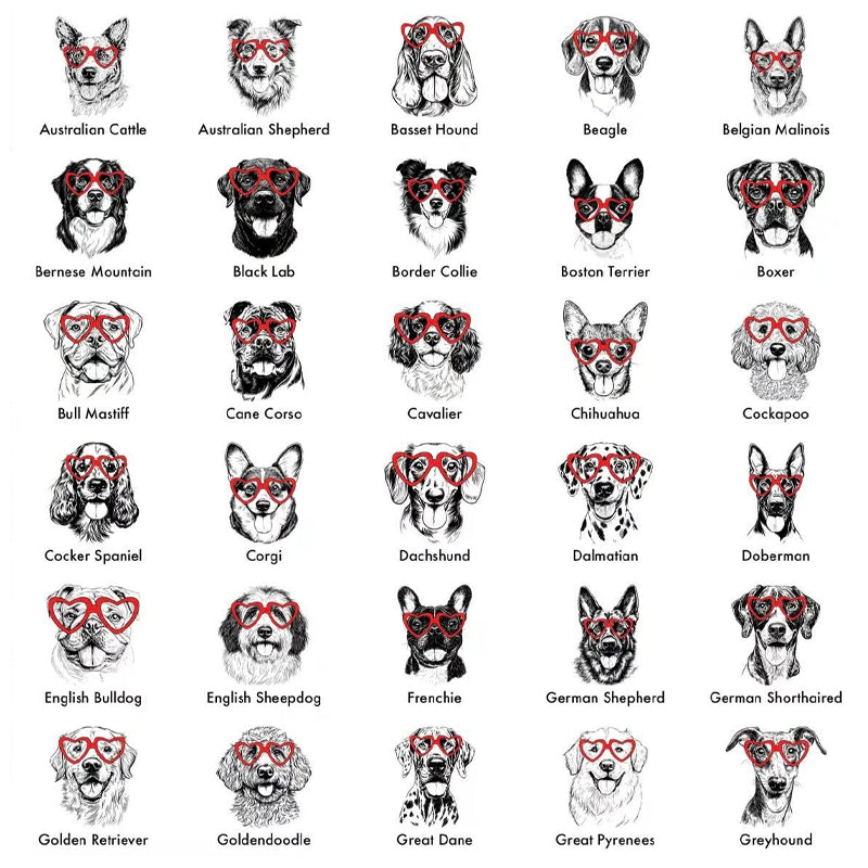 Fun heart-shaped glasses design featuring multiple popular dog breeds.